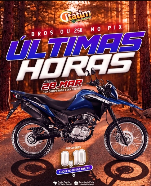 COM APENAS 0,10 VOCÊ CONCORRE A UMA BROS 160 2026 AZUL OU 25 MIL NO PIX! SORTEIO VÁLIDO PELA LOTERIA FEDERAL DO DIA 25 DE MARÇO !!!