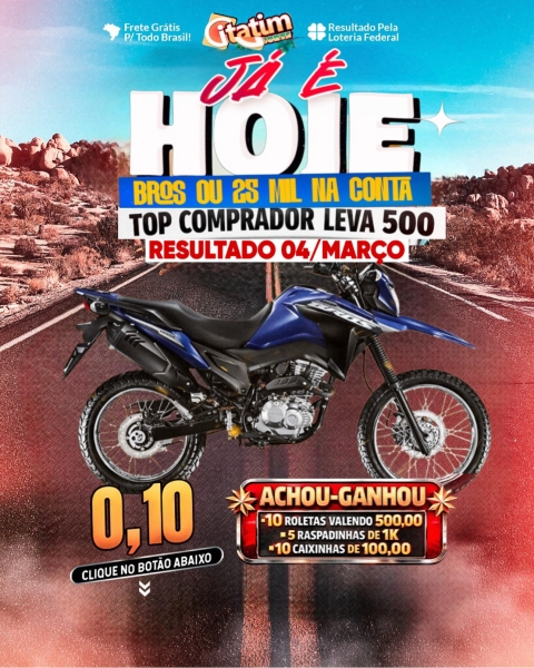 COM APENAS 0,10 VOCÊ CONCORRE A UMA BROS 160 2026 AZUL OU 25 MIL NO PIX! SORTEIO VÁLIDO PELA LOTERIA FEDERAL DO DIA 04 DE MARÇO !!!