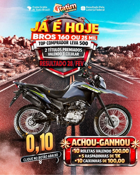 COM APENAS 0,10 VOCÊ CONCORRE A UMA BROS 160 2026 NARGO OU 25 MIL NO PIX! SORTEIO VÁLIDO PELA LOTERIA FEDERAL DO DIA 28 DE FEVEREIRO !!!