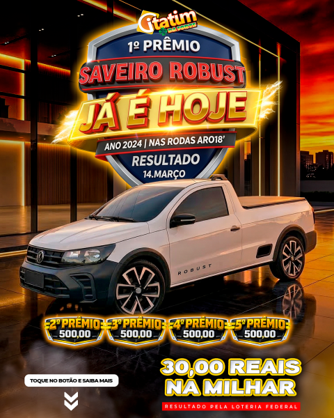 COM APENAS 30,00 REAIS VOCÊ CONCORRE A UM SAVEIRO ANO 2024 NAS RODAS ARO 18 !! SORTEIO VÁLIDO PELA LOTERIA FEDERAL DO DIA 14 DE MARÇO. ENTREGAMOS EM QUAL QUER LUGAR DO BRASIL.